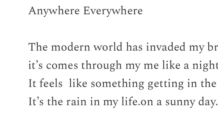 Anywhere Everywhere The modern world has invaded my brain. it’s comes through me like a night train. It feels like something getting in the way. It’s the rain in my life on a sunny day. The latest logarithm becomes my dope, a lot of wasted time to score with a trope. I’ve developed the antisocial gaze. I haven’t left the house in many days. I work …