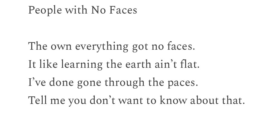 People with No Faces The own everything got no faces. It like learning the earth ain’t flat. I’ve done gone through the paces. Tell me you don’t want to know about that. Though I paid cash up front. you might think it’s bizarre, through a legislation stunt, people with no faces own my auto car. Even knowing they got no faces they got magic mirror on …
